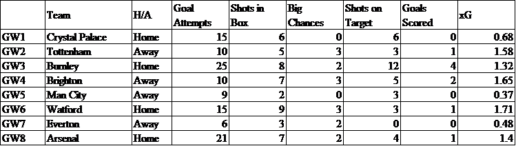 Vietto looks to have cemented his place in the Fulham starting line-up and has already contributed with 4 assists to his name (joint top for strikers). Where Schürrle likes to shoot a lot and looks to be a source of goals, Vietto looks to be the assister in the Fulham team. He ranks fourth for crosses among strikers (11) and top for successful crosses (4). Vietto is also top for chances created (14) and third for big chances created (3). He hasn’t quite found his shooting boots as of yet. From his 7 starts he’s managed 10 goal attempts, 5 of which were from inside the box and 2 on target. The only issue I have with Vietto from an FPL point of view is that he is classified as a striker. Had he been listed as a midfielder I think I would be considering him more.